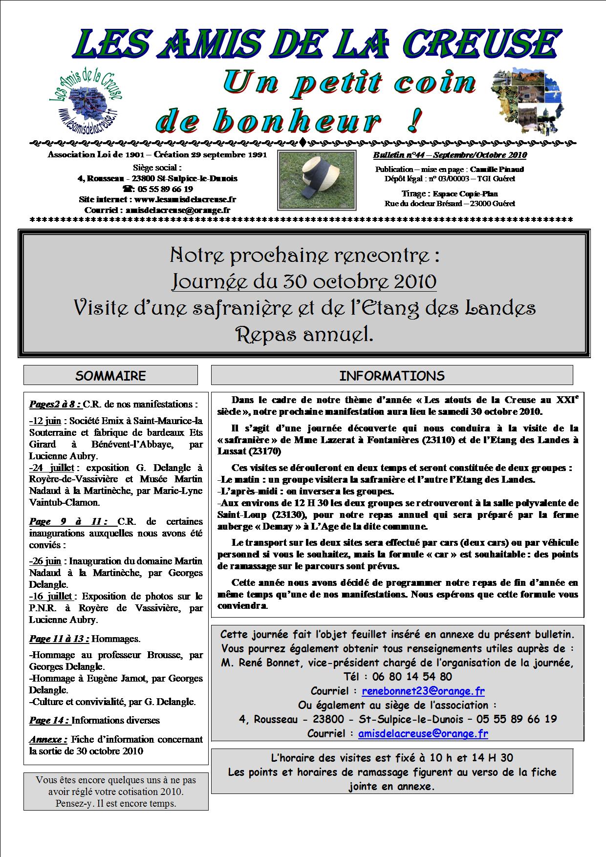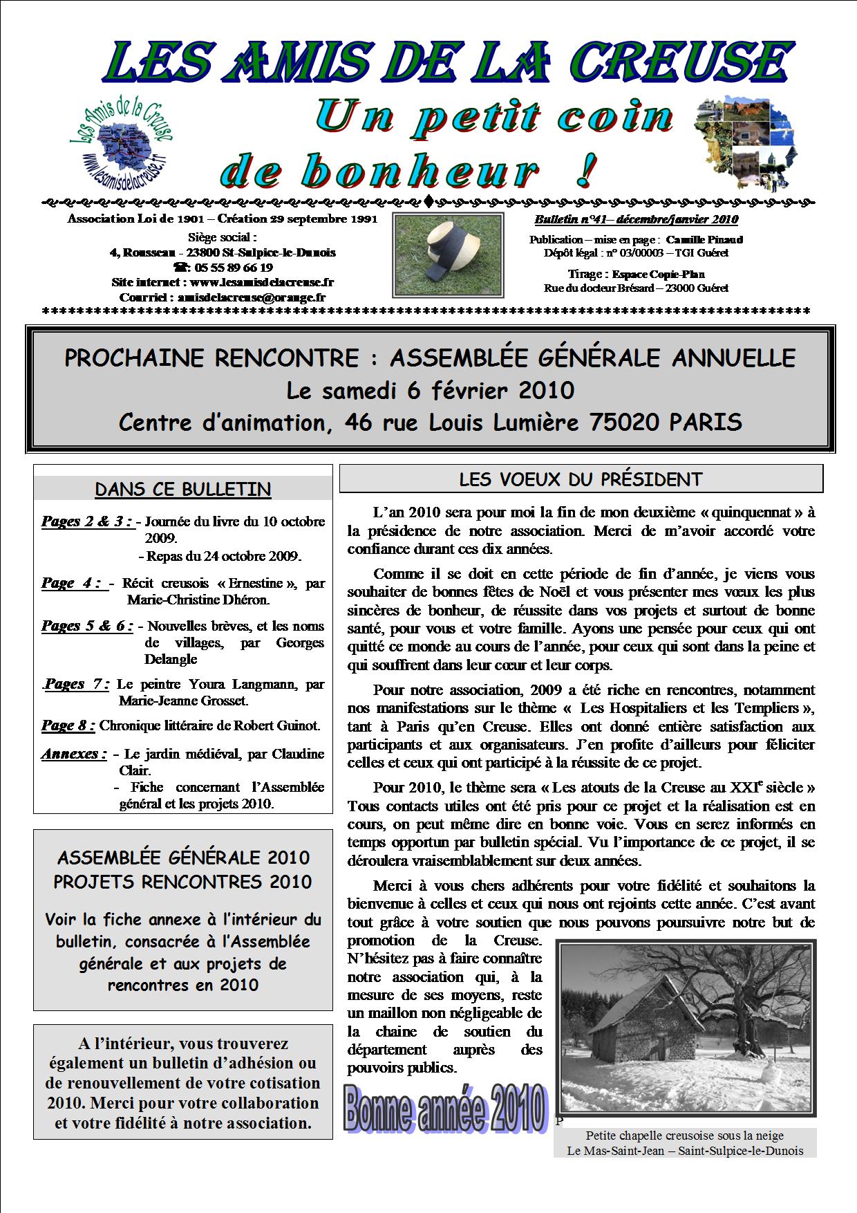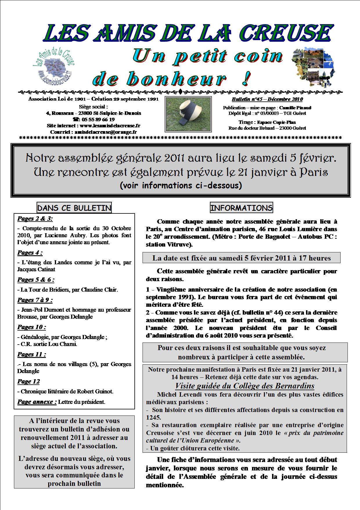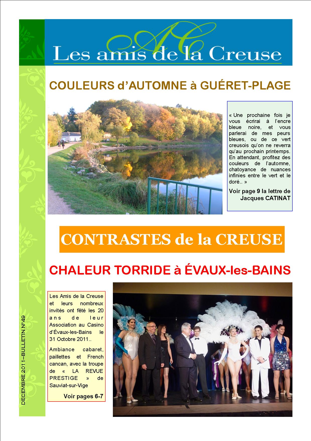 Le Bulletin N° 1 des Amis de la Creuse date de juin 1995. Il fut tout d’abord annuel, puis semestriel puis il sort quatre fois l’an depuis 2005. Les premiers numéros ne comportaient qu’une page recto-verso, puis deux et augmentant chaque année sa capacité il en a compté en moyenne de 12 à 16 pages et plus pour certains. Il fut très apprécié de nos adhérents.